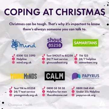 Life can be tough to cope with at any time of the year, but Christmas can be especially difficult. Know that help is out there 24/7/356 🙏